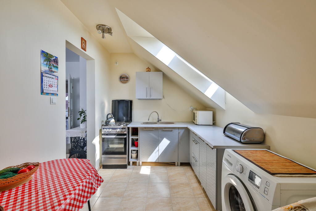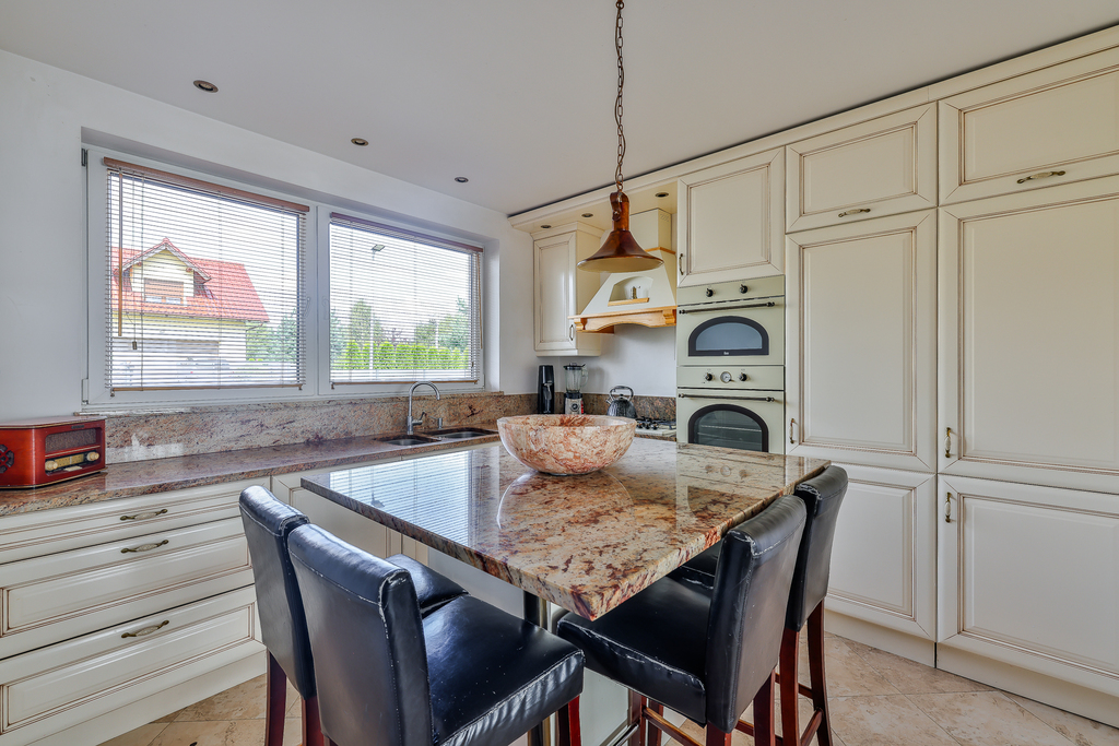 Kuchnia w pełni urządzona z szafkami w zabudowie na wymiar oraz sprzętami AGD, blaty kuchenne wykonane z kamienia (granit).