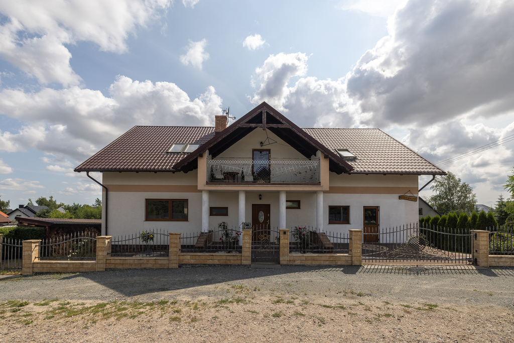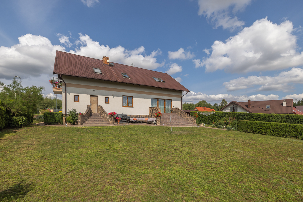Dom wybudowany technologią murowaną z dobrej jakości materiałów (pustak 24cm/styropian 12cm), dach pokryty blachodachówką.