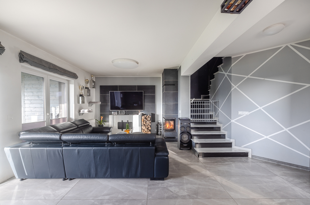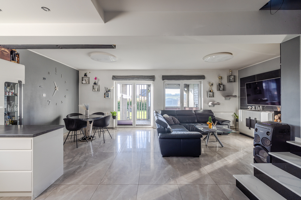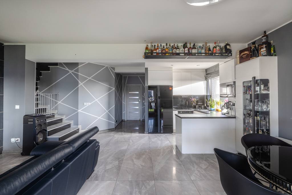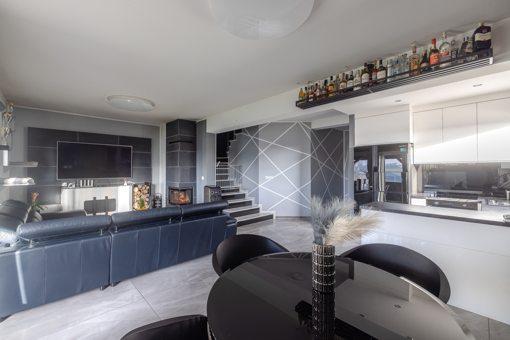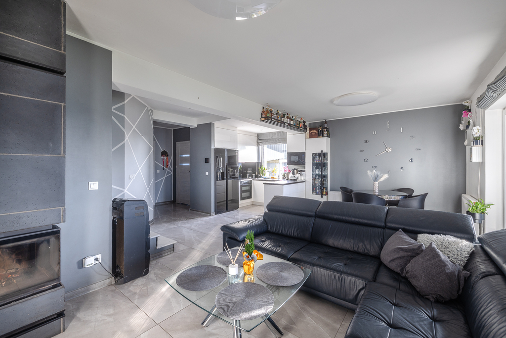 - Przestronny salon z kominkiem i aneksem kuchennym, 34,78 m2