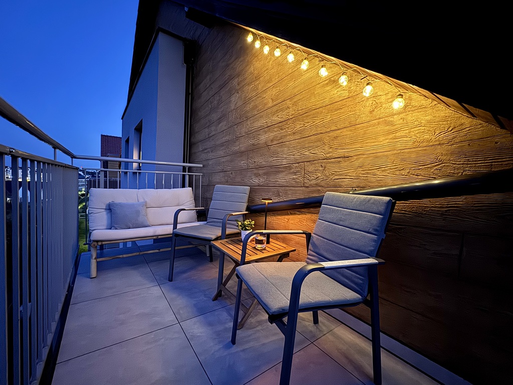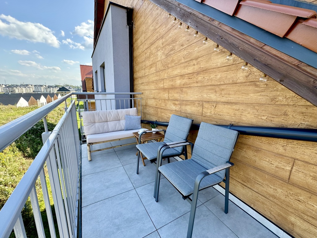 Do mieszkania przynależy duży, dwustronny taras (16 m²) z kompletem mebli wypoczynkowych – idealne miejsce na relaks w słoneczne dni.