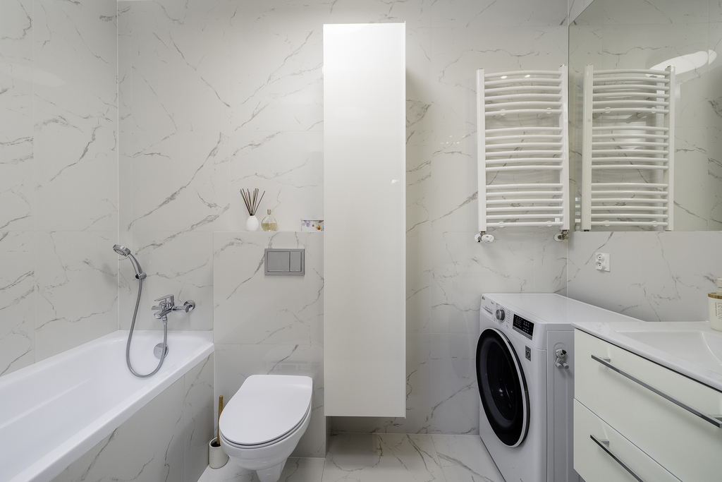 - Łazienka (4,2 m²) – jasna i funkcjonalna, wyposażona w pralkę LG z możliwością sterowania smartfonem.