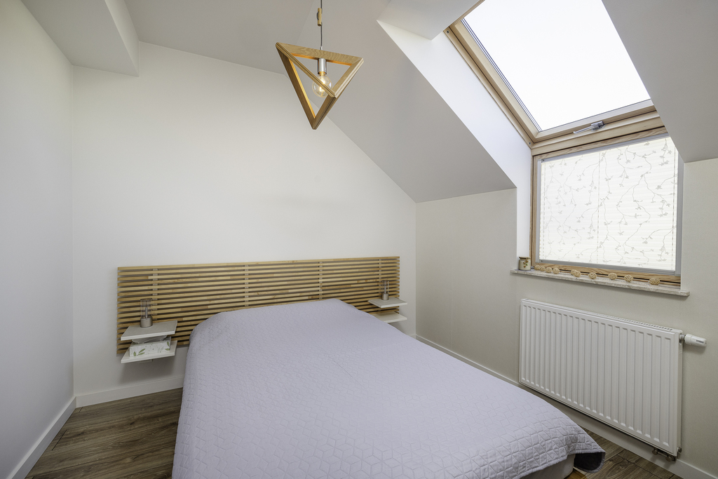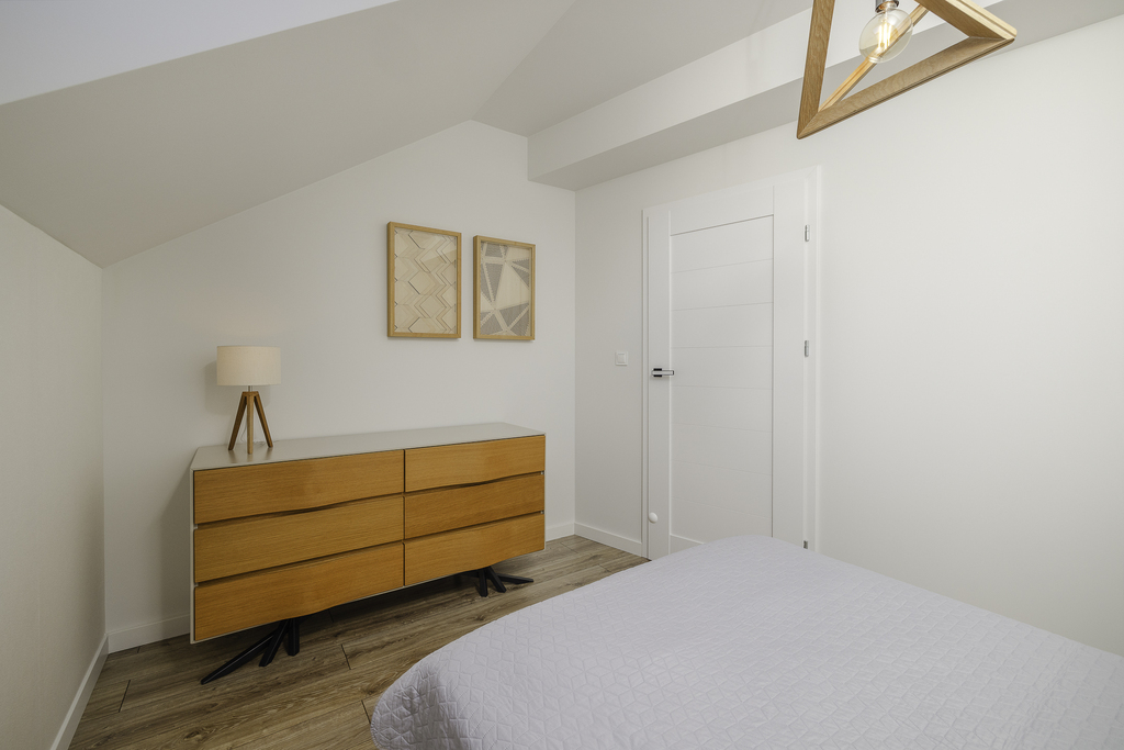 - Sypialnia (9,7 m²) – jasna i minimalistyczna, z drewnianymi meblami i oknem kolankowym Fakro, przez które wieczorem można podziwiać nocne niebo.