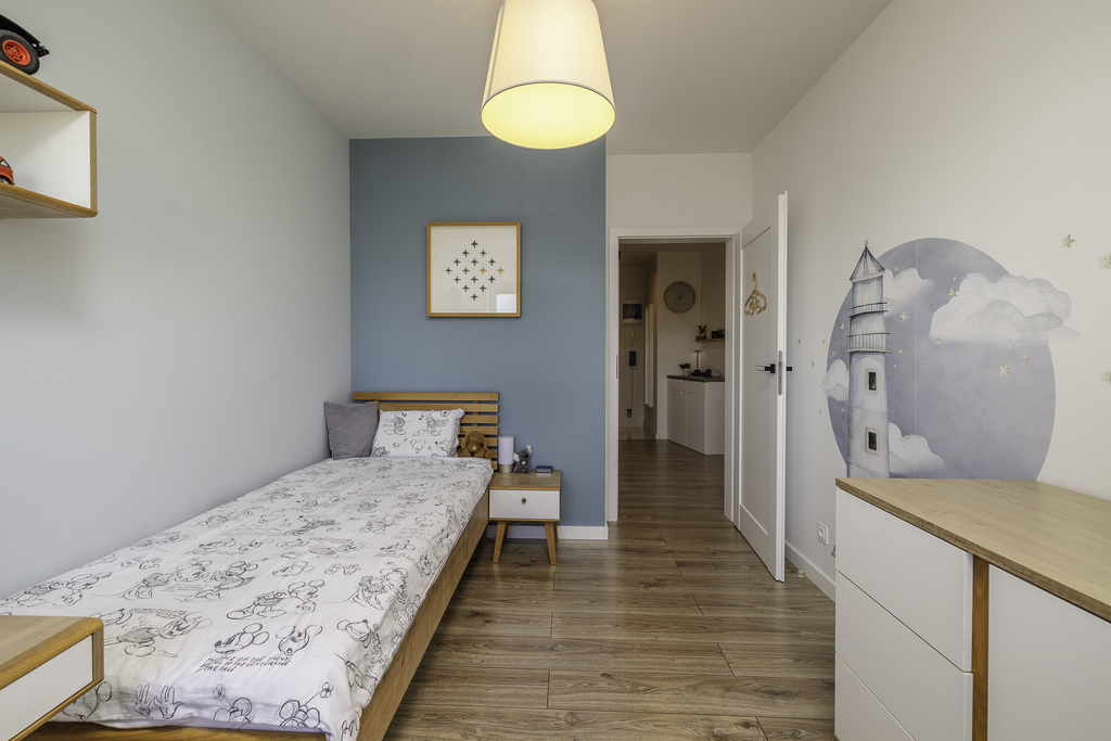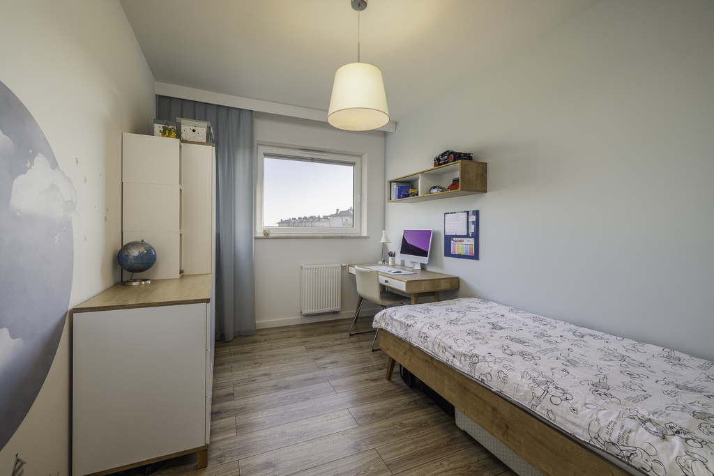 - Pokój (11,8 m²) – idealny na pokój dziecięcy, młodzieżowy lub gabinet. Z okien rozciąga się widok na piękne wschody słońca.