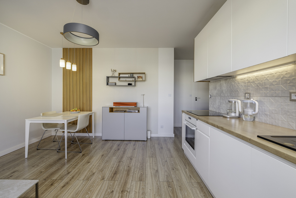 - Salon z aneksem kuchennym (18,6 m²) – zabudowa na wymiar z systemem Blum i sprzętem AGD wysokiej klasy (Bosch, Electrolux). Oświetlenie LED sterowane pilotem z możliwością regulacji barwy i natężenia światła.