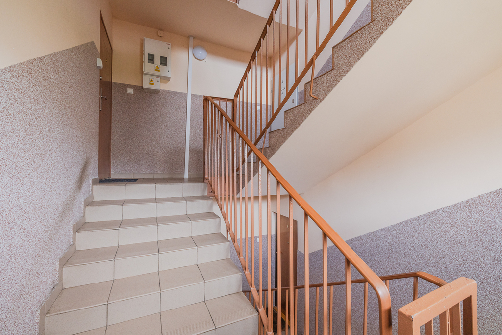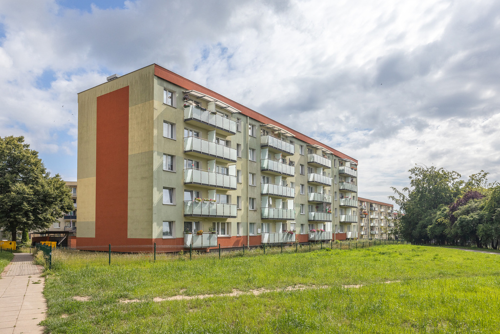 Zadbany blok z odnowionymi balkonami i monitoringiem zapewniającym spokój oraz bezpieczeństwo mieszkańców.