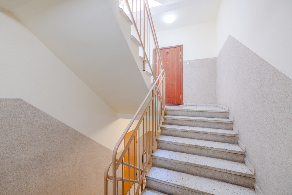 Kameralny niski 2-piętrowy budynek, zadbany. Wejście do klatki schodowej zabezpieczone domofonem.