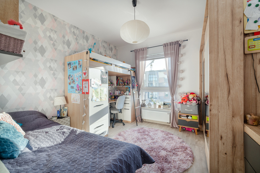 -Sypialnia (12,7 m²) – zabudowana szafa oraz biurko na wymiar.