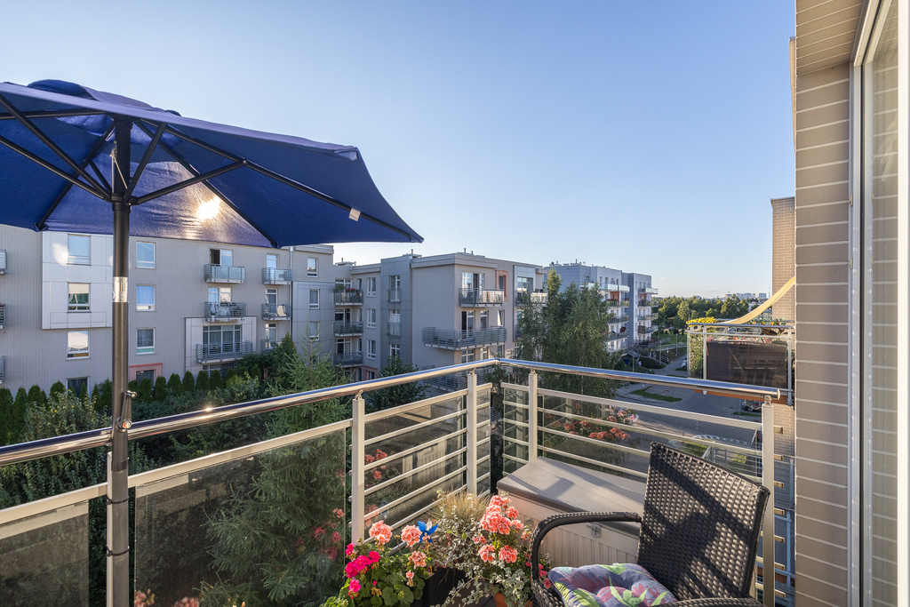 Przestronny balkon z widokiem na zieleń.