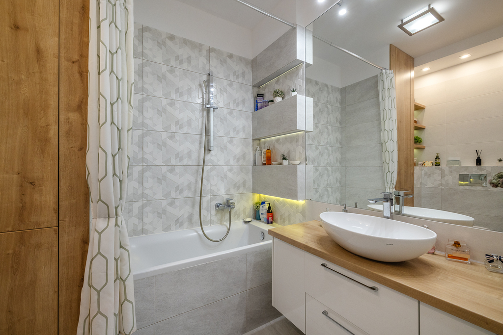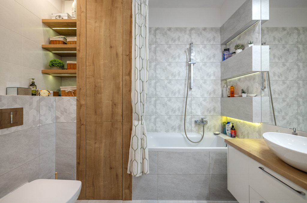 -Łazienka (5 m²) – duży prysznic, umywalka z pojemną szafką, zabudowana pralka.