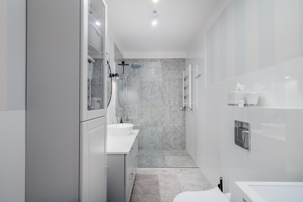 - Łazienka – elegancko urządzona, wyposażona w prysznic typu walk-in.