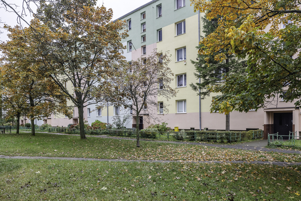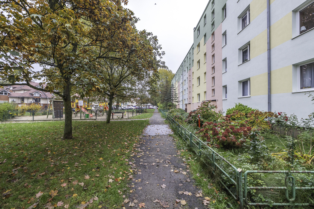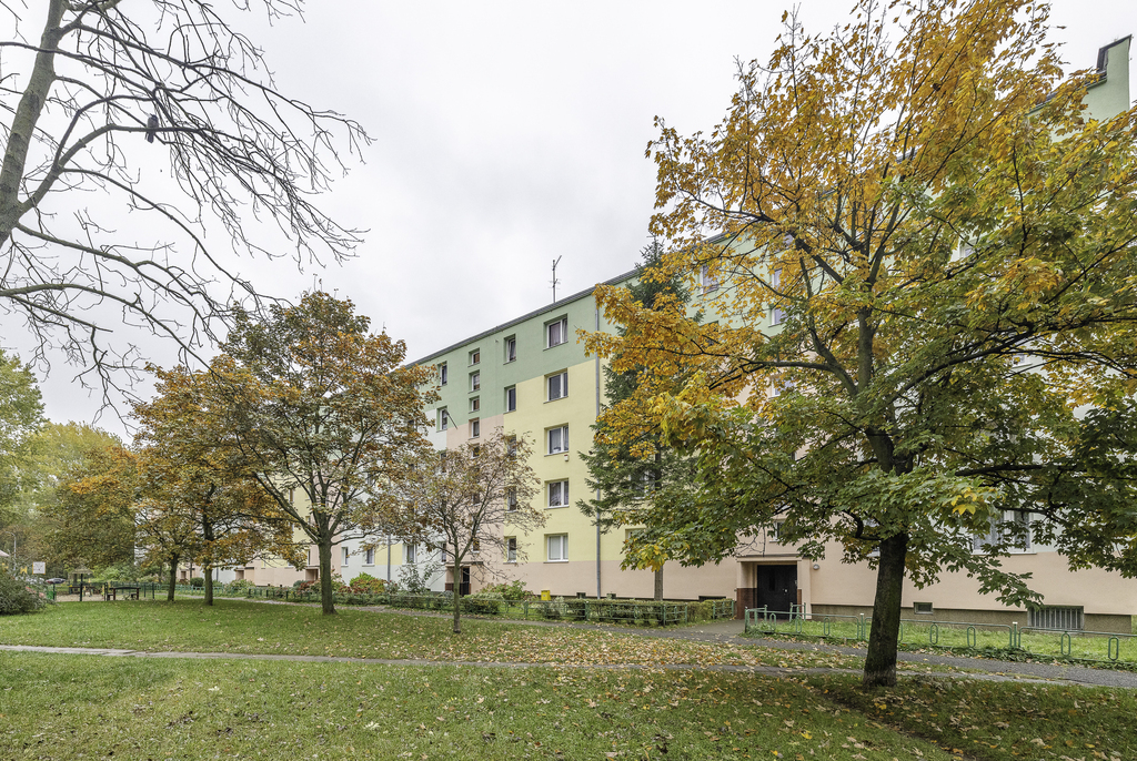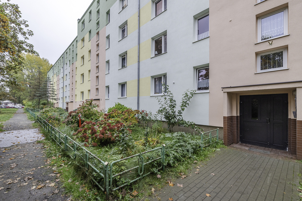 Mieszkanie znajduje się na czwartym piętrze czteropiętrowego budynku z lat 70., z zadbaną klatką schodową i spokojnym sąsiedztwem.