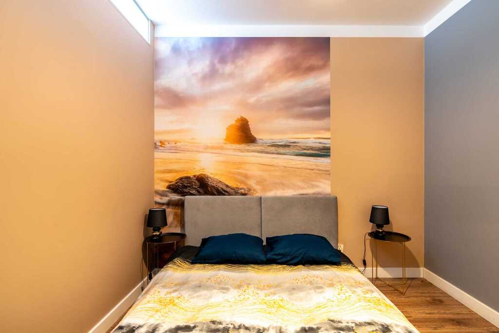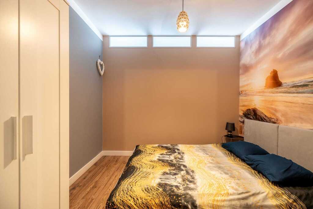 W jego skład wchodzi przestronny salon z aneksem kuchennym, dwie niezależne sypialnie, komfortowa łazienka oraz ustawna loggia z widokiem na Motławę, idealna do wypoczynku.