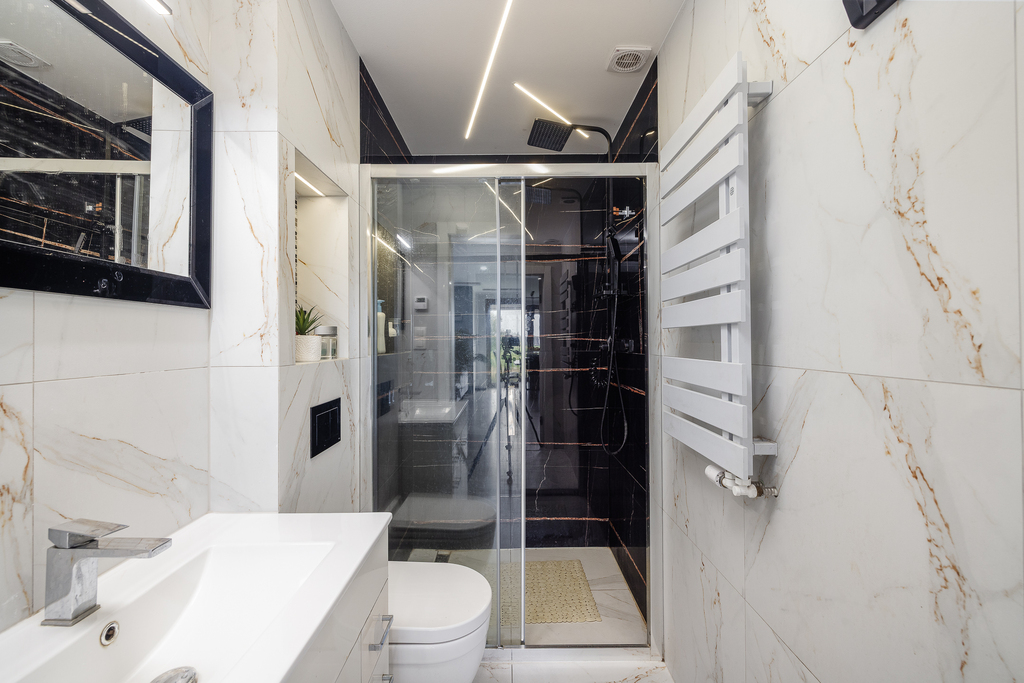 - łazienka z wanną oraz prysznicem i dwoma umywalkami,