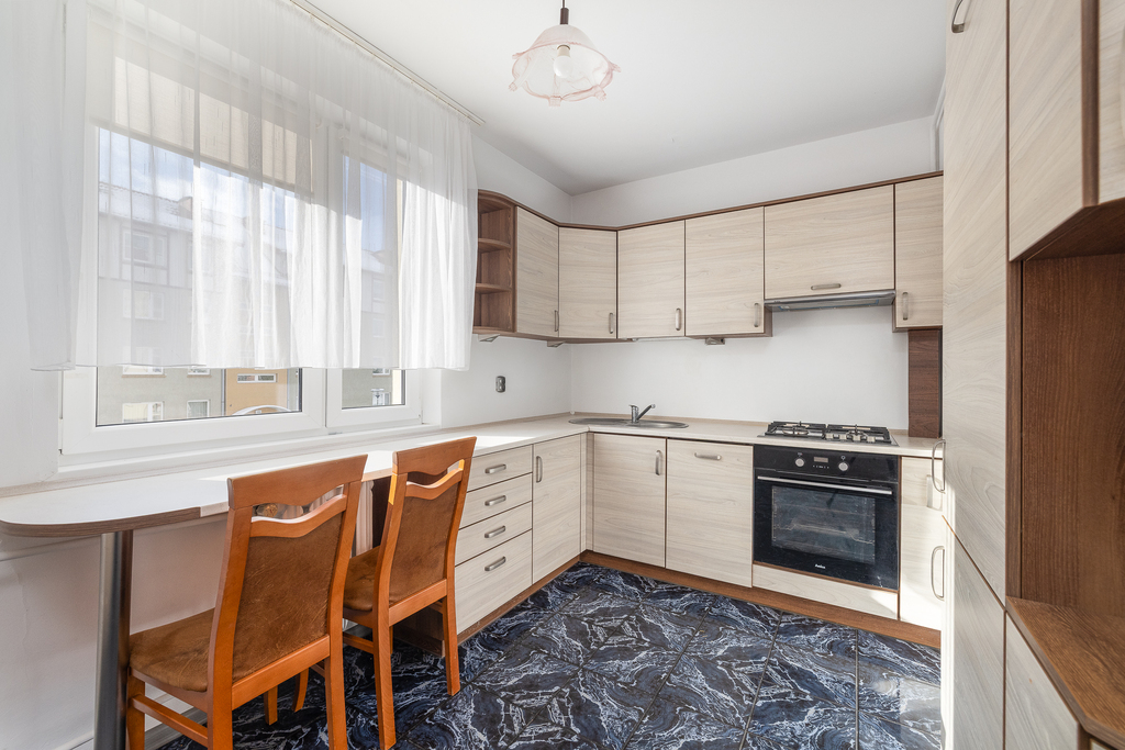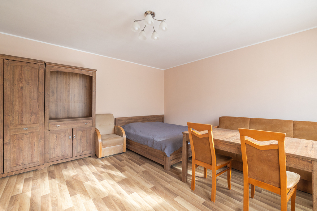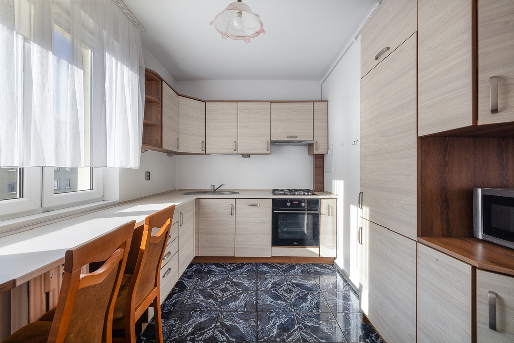 - Przestronny pokój dzienny z wyjściem na duży balkon zapewnia komfortową przestrzeń do wypoczynku. - Oddzielna kuchnia pozwala na swobodne przygotowywanie posiłków.