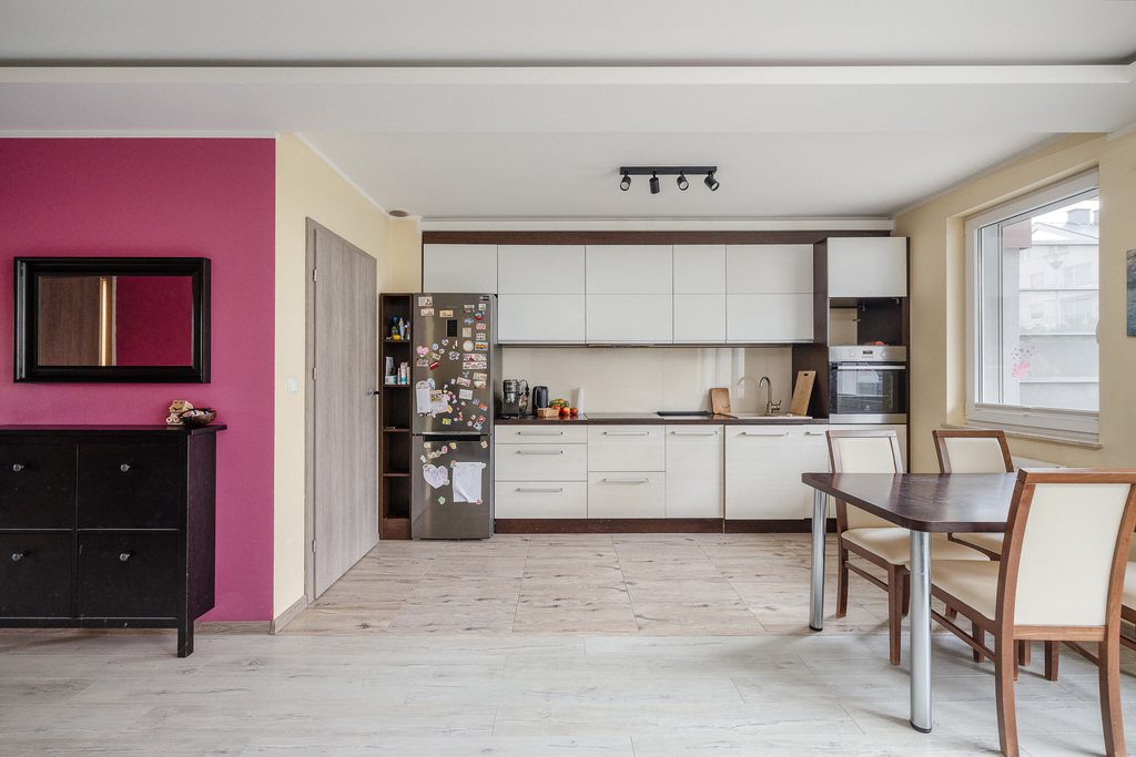 Kuchnia w zabudowie, wyposażona w sprzęt AGD.