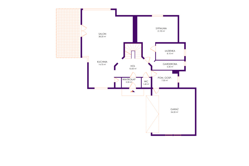•salon (38,3 m²) z kominkiem i wyjściem na taras
